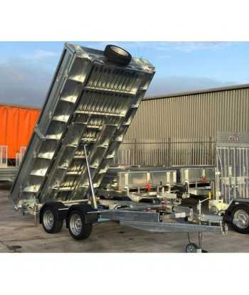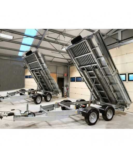 La volquete hidráulica, con un ángulo de basculamiento de 50°, es accionada por un cilindro de 4 etapas y una electrobomba de 12 V con batería, ofreciendo una gran eficiencia de descarga.