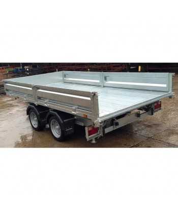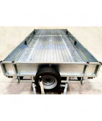 Las paredes laterales de 300 mm están fabricadas en chapa de acero perfilada, lo que las hace robustas y duraderas. La puerta trasera está diseñada para una doble apertura, facilitando el acceso al remolque incluso para cargas voluminosas.